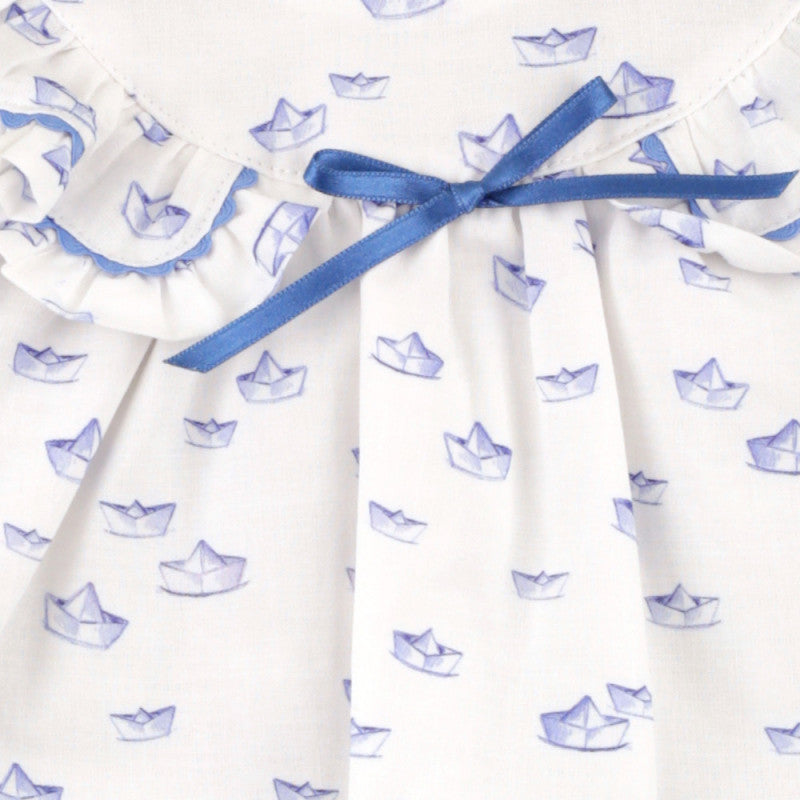 Vestido de barquitos azules con cubre pañal y sombrero.